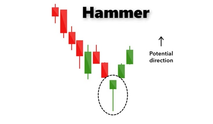 The hammer candle chart pattern, consisting of short entities and long, low shadow lines, shows us that despite selling pressure on the day, it was then offset by strong buying pressure, driving prices up. The green hammer (price closing above the opening) is stronger than the red hammer (price closing below the opening).
