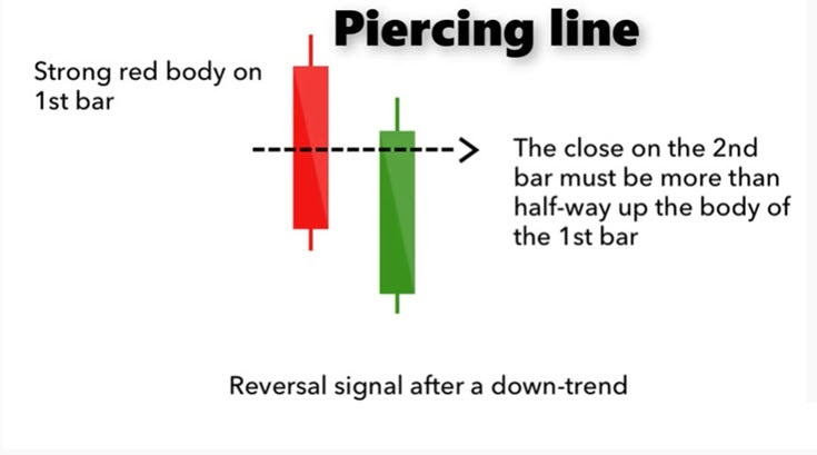 The piercing line, and the bullish eating line, is a double candlestick shape. The first candle is a long red candle (bearish). The next candle is a long green candle (bullish). It typicalso ally includes a downward jump between the closing price of the first candle and the opening price of the next candle.