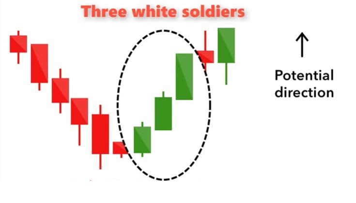This pattern lasts for three days and consists of bullish green candles with small shades, each closing higher than the previous day. This is a very strong bullish signal, indicating a reversal of the downtrend.